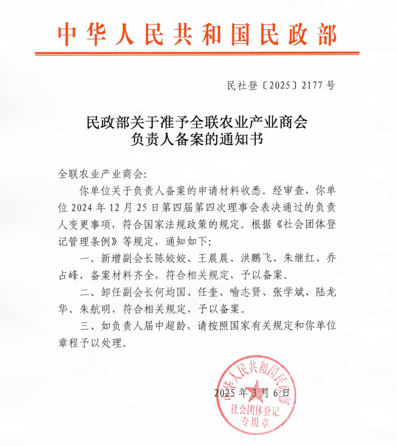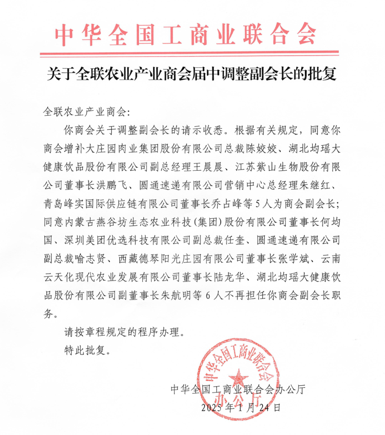 在大會(huì)正式召開之前,全國(guó)工商聯(lián)農(nóng)業(yè)產(chǎn)業(yè)商會(huì)還召開了第四屆第四次理事會(huì)、第七次常務(wù)理事會(huì)暨第九次會(huì)長(zhǎng)辦公會(huì)。會(huì)議匯報(bào)了2024年商會(huì)工作情況及2025年工作計(jì)劃,并審議通過(guò)了新增及調(diào)整副會(huì)長(zhǎng)人員名單,分支機(jī)構(gòu)成立的申請(qǐng)和論壇活動(dòng)管理制度等事項(xiàng),并傳達(dá)全國(guó)工商聯(lián)沈瑩書記一行調(diào)研商會(huì)時(shí)的講話要點(diǎn)。大莊園集團(tuán)總裁陳姣姣當(dāng)選全國(guó)工商聯(lián)農(nóng)業(yè)產(chǎn)業(yè)商會(huì)副會(huì)長(zhǎng)。