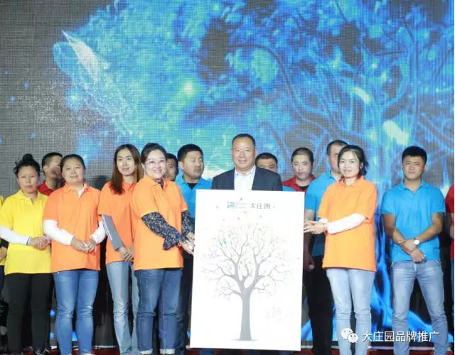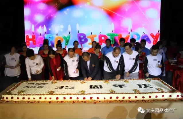 長3米5的35周年生日蛋糕推至臺前,它代表莊園35年的事業(yè)步步高升,蒸蒸日上?,F(xiàn)場700余名員工集體合唱《生日歌》,并且大莊園全體員工為董事長準(zhǔn)備了一棵由每一位莊園員工的指紋組成的莊園樹。“一棵樹,一家人”代表著所有莊園人在大莊園這棵大樹下吸取養(yǎng)分,茁壯成長。